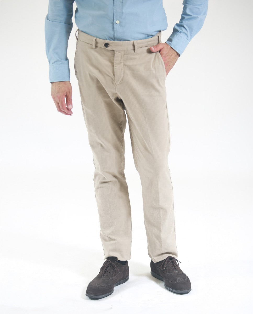 Calças com bolsos inclinados, fecho de correr e um botão.