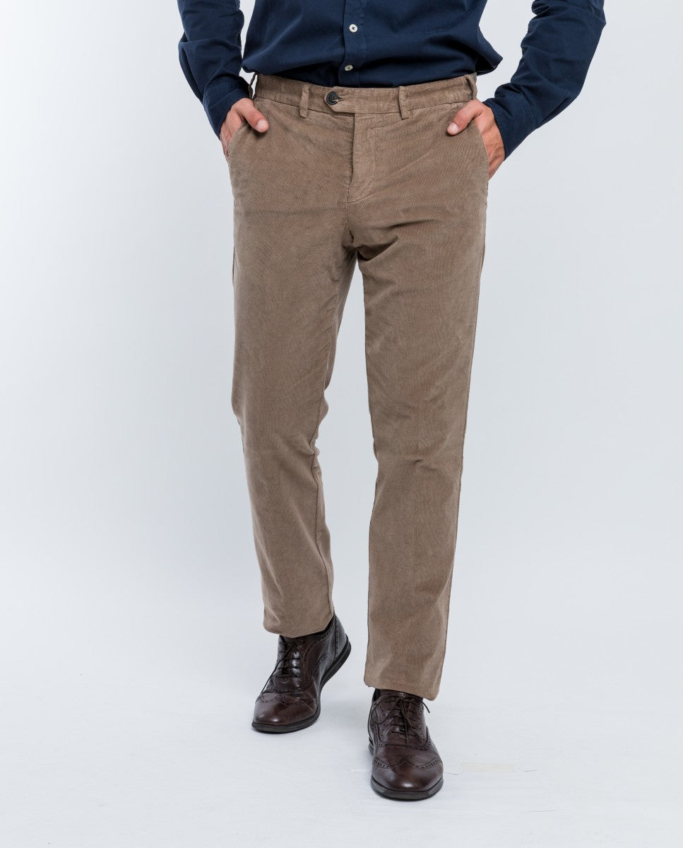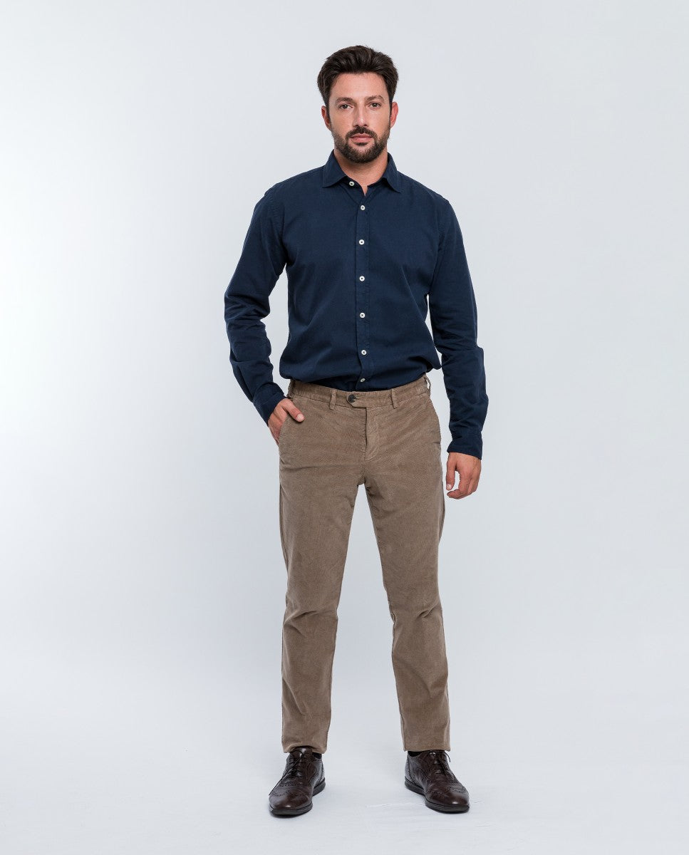 Calças com bolsos inclinados, fecho de correr e um botão.